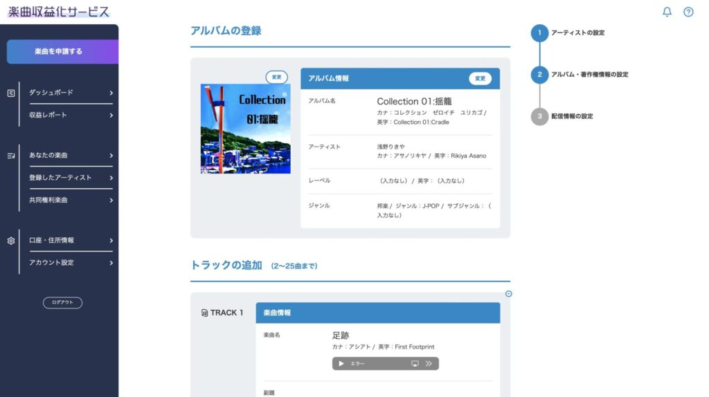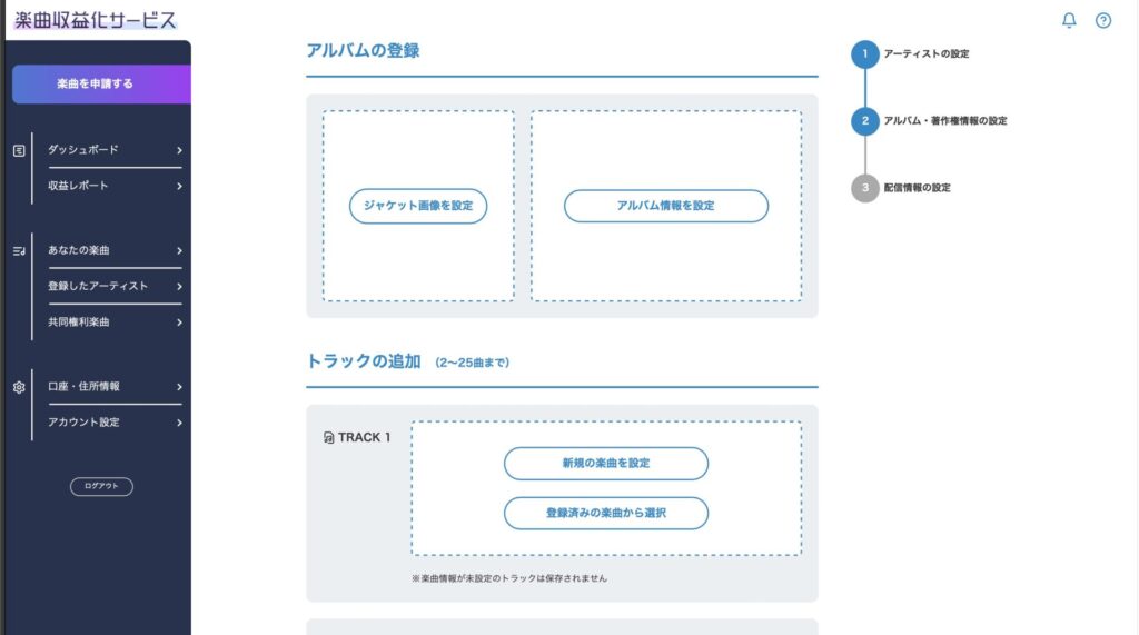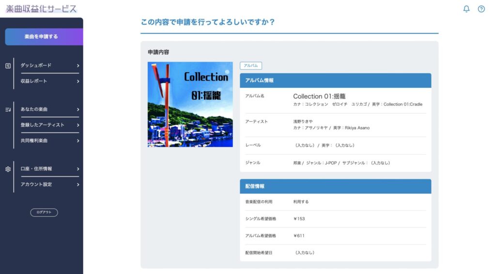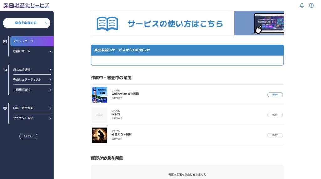 自分のどの曲が楽曲収益化サービスを利用しているのか、申請内容は何なのか、現在の手続きの段階や配信状況など、情報を得られるマイページ的な画面がありません。