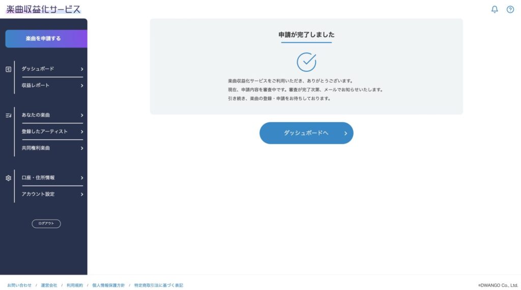 申請してから数日〜数週間後に「楽曲審査が完了しました」というメールが登録したメールアドレス宛に届きます。
